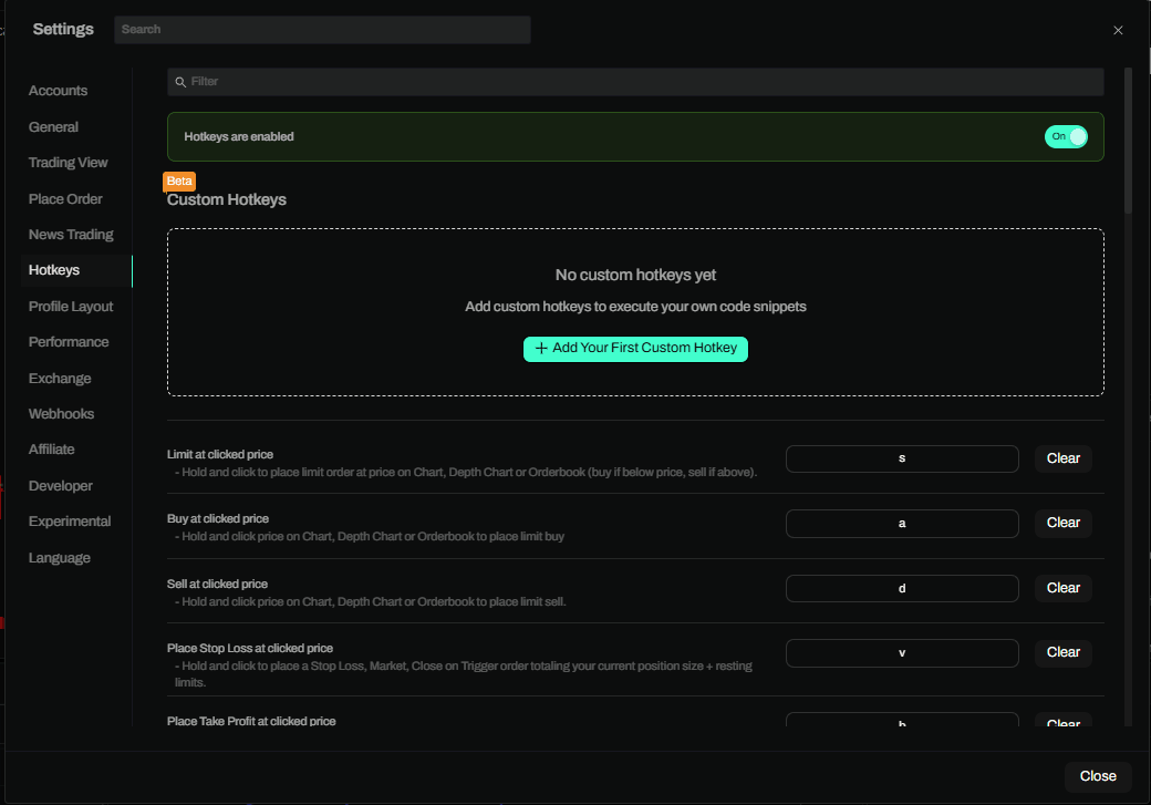 Here you can change various settings for the terminal. Such as draggable orders, Risk management tools, Hotkeys, and more.