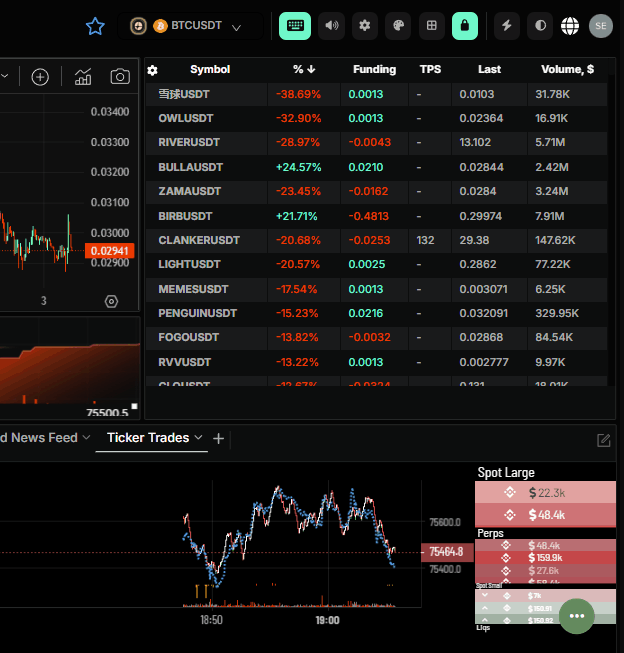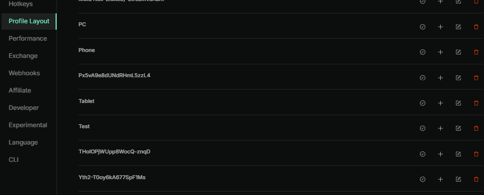 Inside your settings is the profiles category. A profile is a collection of settings and windows that you can save and load at any time. This allows you to have different profiles for different trading strategies, environments, or exchanges.