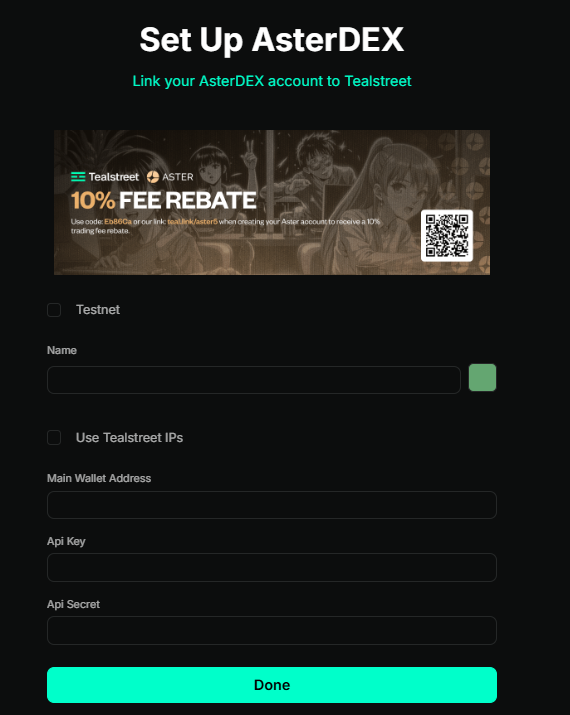 - Proceed to fill out the form with the information you got when you created the API on the AsterDex API page. - Give the key a name, this can be anything you want. - Choose the color you want your API to be in the terminal. - If you are using whitelisting, tick the box for Use Tealstreet IP's. - Provide the Main Wallet Address of the wallet you used to sign the transactions when making the API Key. - Provide the API Wallet Adress AsterDex you generated in AsterDex when making the API Key. - Provide the API Secret AsterDex showed you when you authorized the API Key. - Click done.